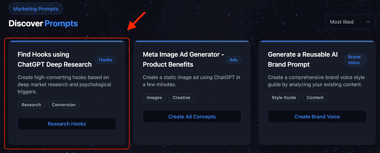 To find those hooks I used an awesome free tool we built called Smart Marketer AI. This is a library of customizable direct response marketing prompts, and it only takes a second to sign up if you want to follow along.