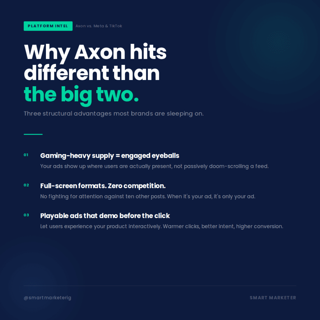 Because today, your video is the campaign, and on Axon, that reality gets amplified. You’re no longer fighting for two seconds of attention in a crowded feed. You’re getting something most platforms can’t offer anymore: focused, uninterrupted attention from someone who’s actually engaged in what they’re doing.